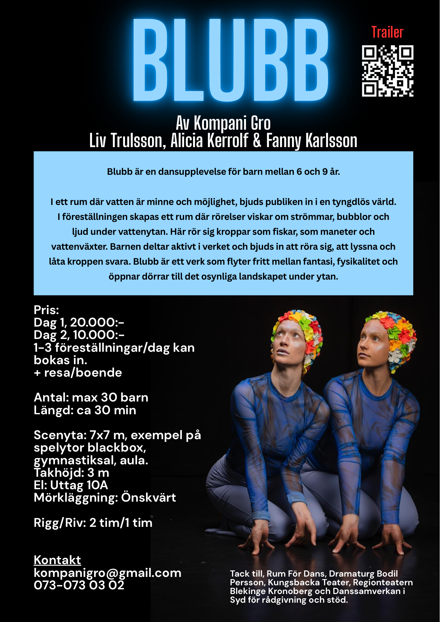 I ett rum där vatten är minne och möjlighet, bjuds publiken in i en tyngdlös värld. I föreställningen skapas ett rum där rörelser viskar om strömmar, bubblor och ljud under vattenytan. Här rör sig kroppar som fiskar, som maneter och vattenväxter. Barnen deltar aktivt i verket och bjuds in att röra sig, att lyssna och låta kroppen svara. Blubb är ett verk som flyter fritt mellan fantasi, fysikalitet och öppnar dörrar till det osynliga landskapet under ytan.